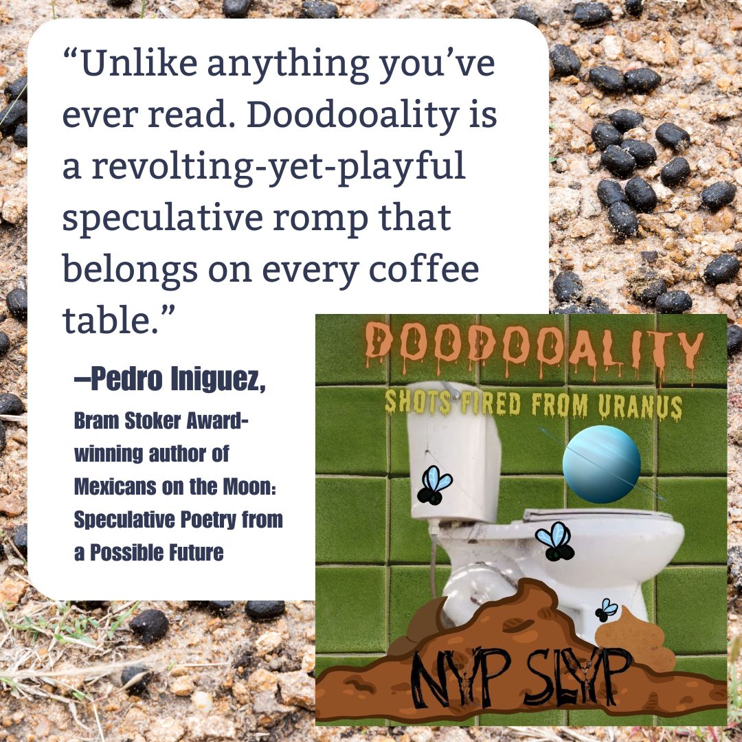 Doodooality: Shots Fired from Uranus contains steaming hot pooetry by the ass-tonishingly talented highly ass-steamed NypSlyp, comprised of Sumiko “Dooky” Saulson defecating on the microphone, Emily “Skunkheart” Flummox putting the stank on air guitar, and Mr. Backup (known for his creamy mudslides) crapping out the backup vocals. A juicy collection of limmershits, rectumic, iambic pootameter, haipoo, and loose stool pooetry, our splatterpoop hit Doodooality can be found in bathrooms everywhere.